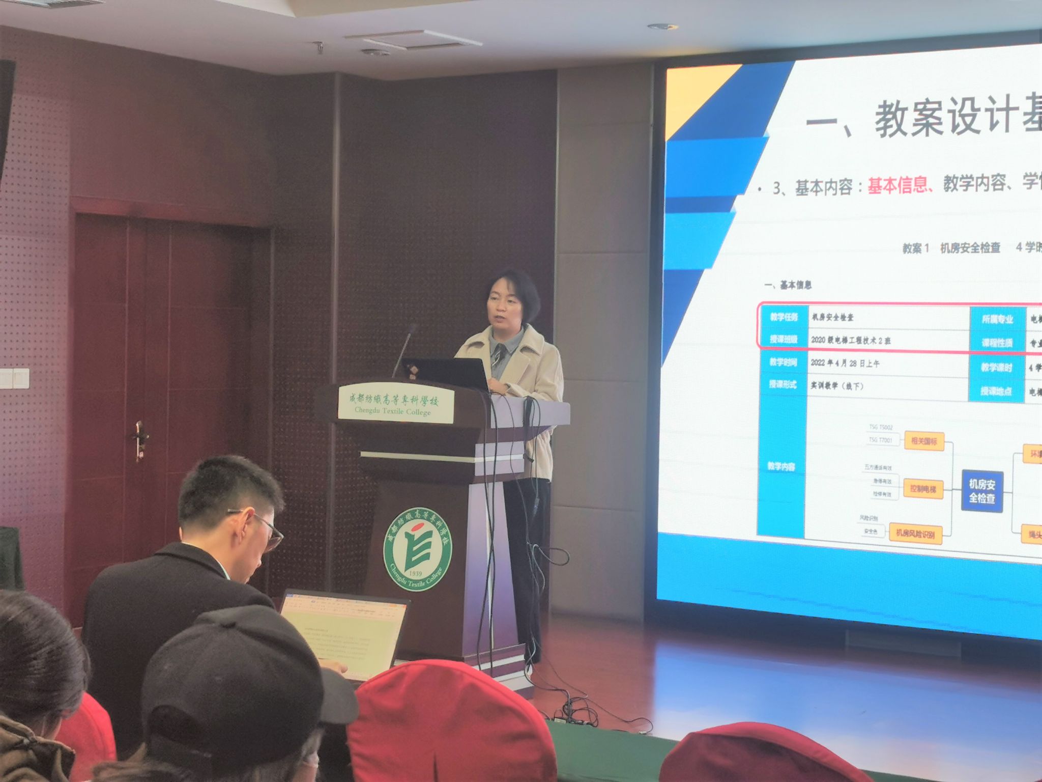 本次会议共邀请4位教师代表发言,分享个人教案设计经验与心得。智能制造与装备学院朱霞老师和马克思主义学院宝娟老师作为四川省职业院校教师教学能力大赛省赛获奖教师,从教案设计的基本要素、设计过程、重点要素及课程思政融入等方面进行了经验分享。电气信息工程学院赵聃敏老师和人文与通识教育学院孟艳老师作为青年教师代表,从个人教案设计心得出发,提出了教案设计的难点及创新瓶颈。